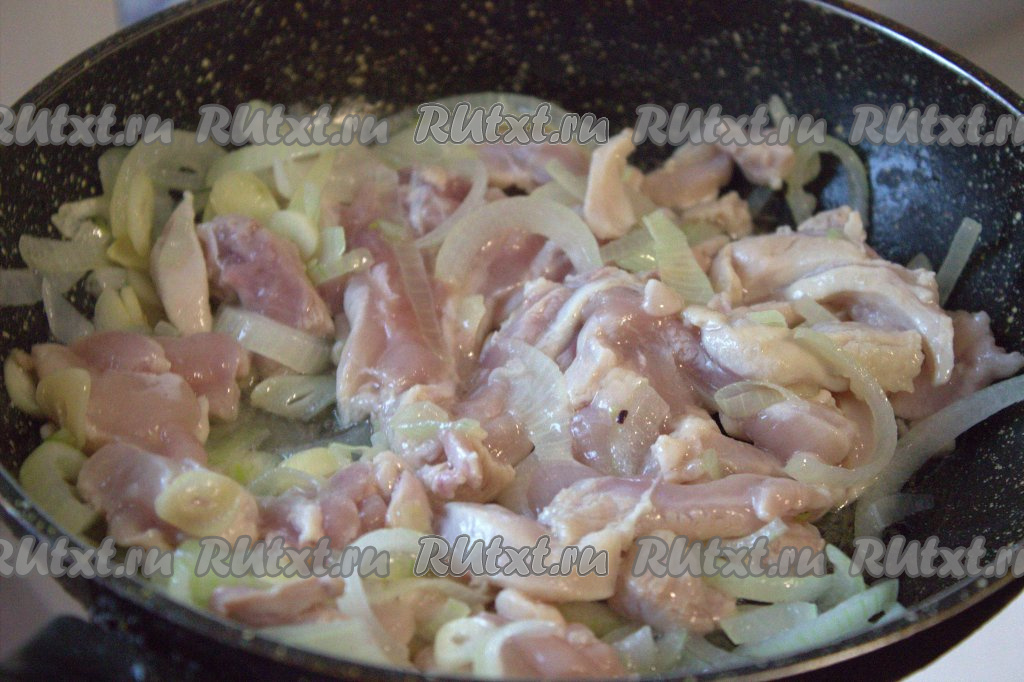 Затем к луку с чесноком выложить куриное мясо и на достаточно сильном огне обжарить его до изменения цвета (примерно, 2-3 минуты), помешивая, слегка посолить.