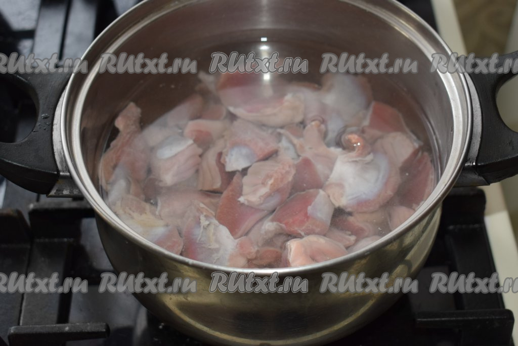 Далее в кастрюлю выкладываем подготовленные желудки, вливаем столько воды, чтобы она была выше уровня желудочков на 1 см. Бульон, в котором будут вариться желудки, нам понадобится в дальнейшем, поэтому много воды не наливаем, пусть бульон будет насыщенным.