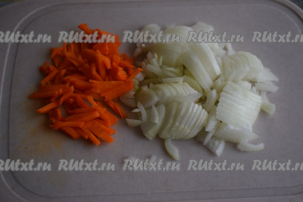 Пока варятся желудочки, очистим лук и морковь. Нарежем лук четверть кольцами, а морковь - соломкой.