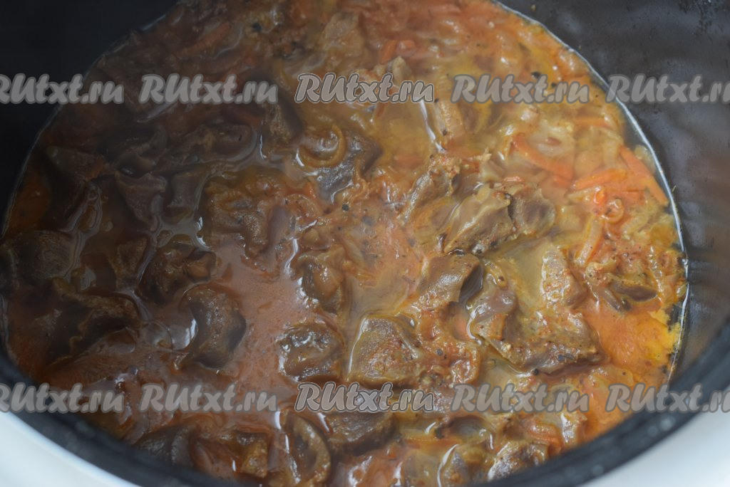 Заливаем бульоном, в котором желудки варились. Доводим содержимое сковороды до кипения, уменьшаем огонь до минимума и тушим желудки индейки в течение 40-50 минут. Я же решила потушить не в сковороде, а в мультиварке, для этого отваренные желудки вместе с бульоном и обжаренными овощами переложила в чашу мультиварки и готовила на режиме "Тушение" 1 час под закрытой крышкой (в процессе тушения крышку не открываем).
