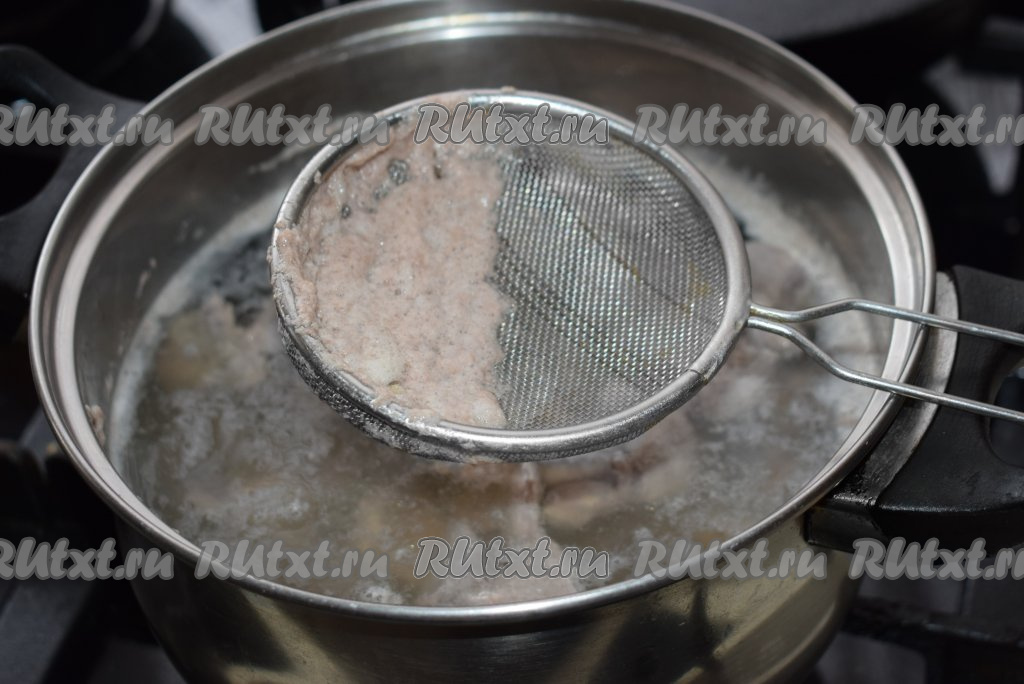 Ставим кастрюлю с желудками на огонь. Когда вода закипит, снимаем пену при помощи ситечка. Солим по вкусу и варим желудки на медленном огне 40-50 минут.
