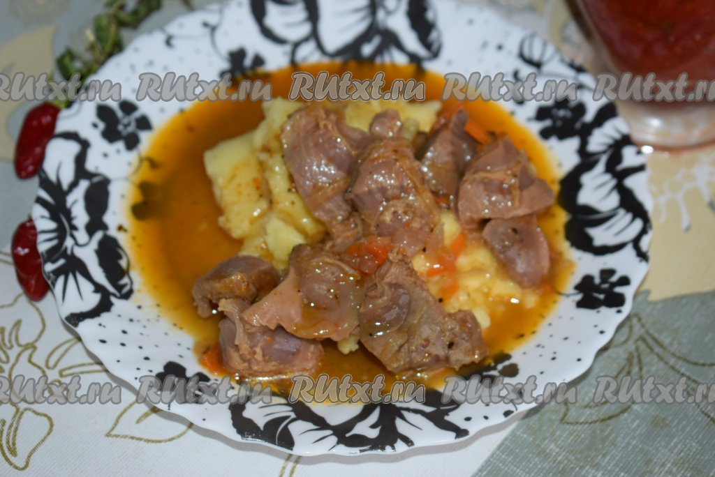 Я подала желудки индейки с картофельным пюре, поливая его наваристой подливой, образовавшейся в процессе тушения. Блюдо я дополнила аджикой. Обед понравился всей семье!