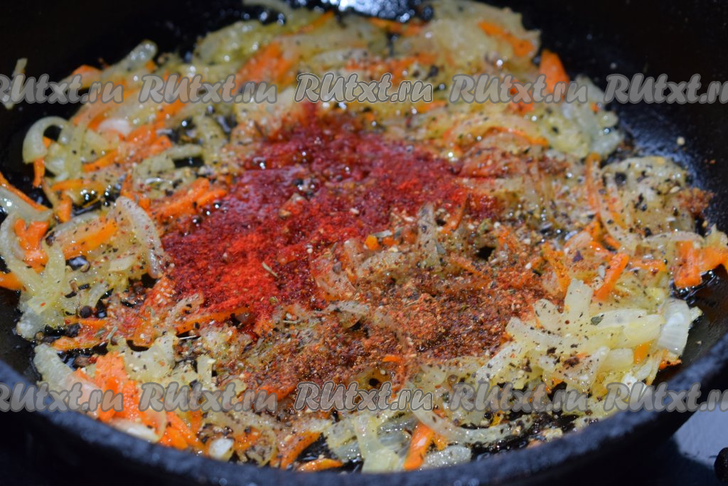 К обжаренным овощам добавляем соль, специи, чёрный молотый перец, перемешиваем и выключаем огонь.