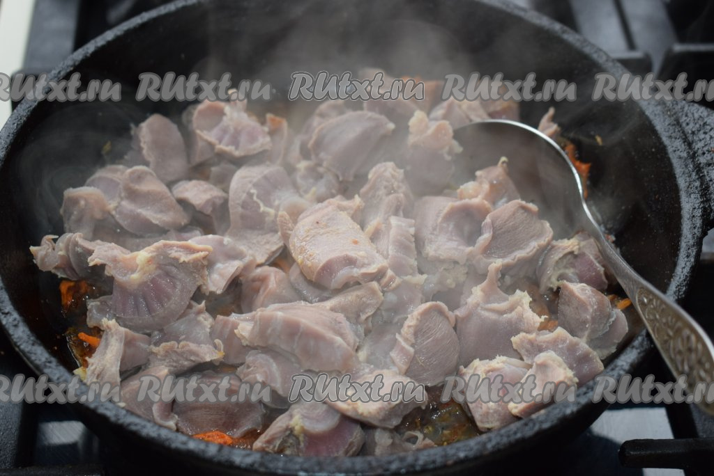 Когда желудки проварятся 40-50 минут с момента закипания, перекладываем их в сковороду с овощами.