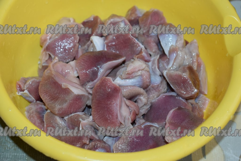 Индюшиные желудки промыть под проточной водой, удалить твёрдые плёночки и нарезать желудочки на кусочки.