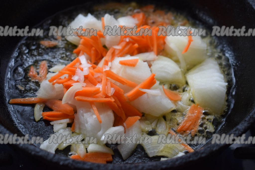 В сковороде разогреем сливочное и растительное масло, выложим нарезанные овощи и обжарим их на слабом огне, накрыв крышкой, до прозрачности лука (примерно, 5 минут), периодически их помешивая.