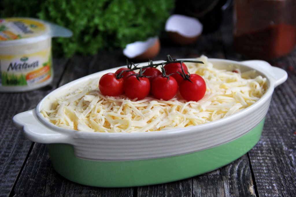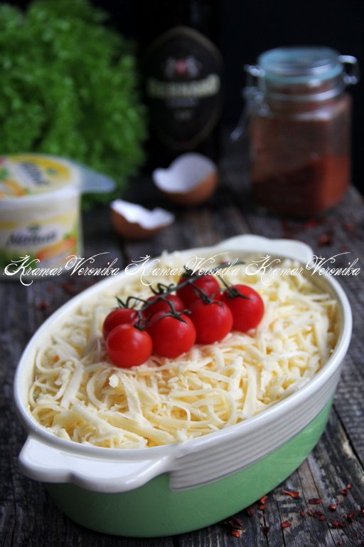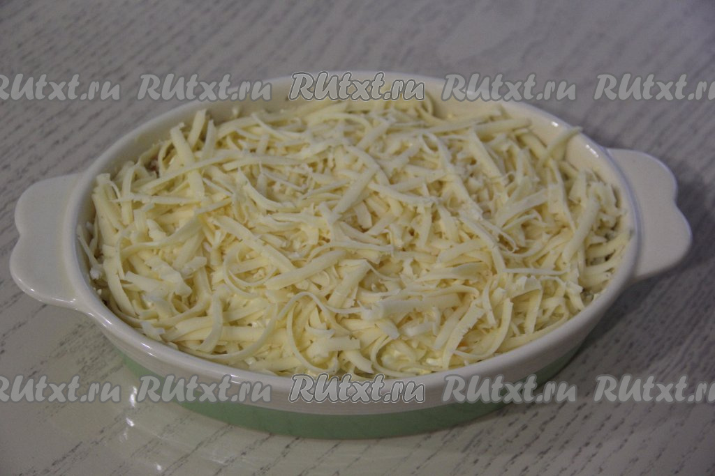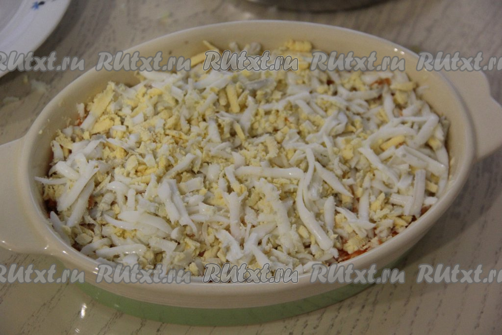 Завершающим слоем выложить натёртый сыр. Салатник (или форму) накрыть пищевой плёнкой и убрать в холодильник на пару часов.