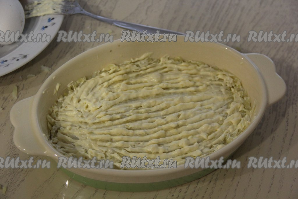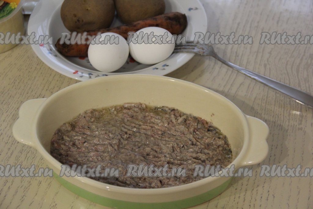 Смазать майонезом слой картофеля, можно немного присолить, а затем слегка утрамбовать.