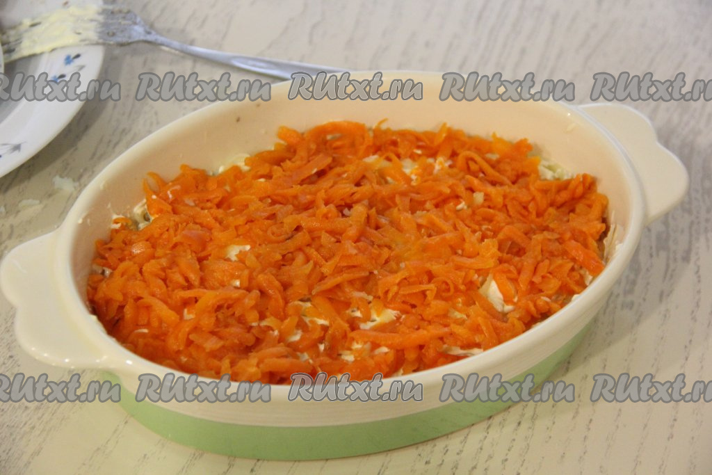 Следующим слоем равномерно выложить очищенную и натёртую варёную морковку.