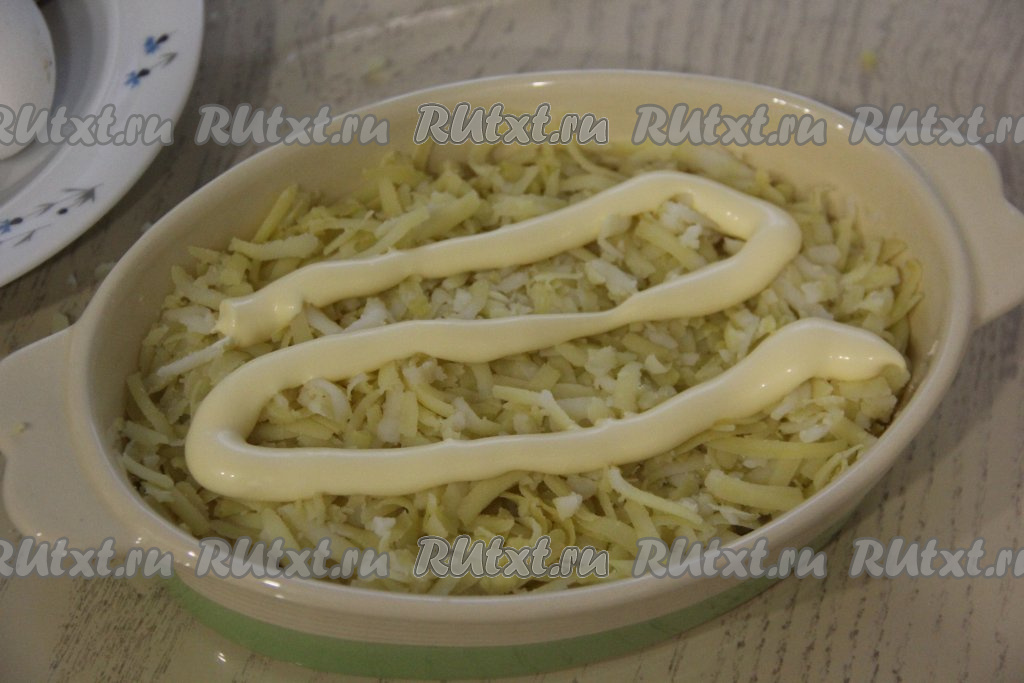 Очистить остывшую картошку, натереть на тёрке и выложить поверх рыбы, разровнять, нанести майонез.