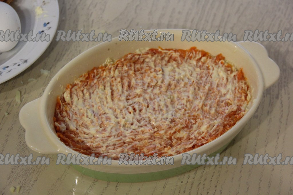 Слой моркови смазать майонезом и слегка утрамбовать.