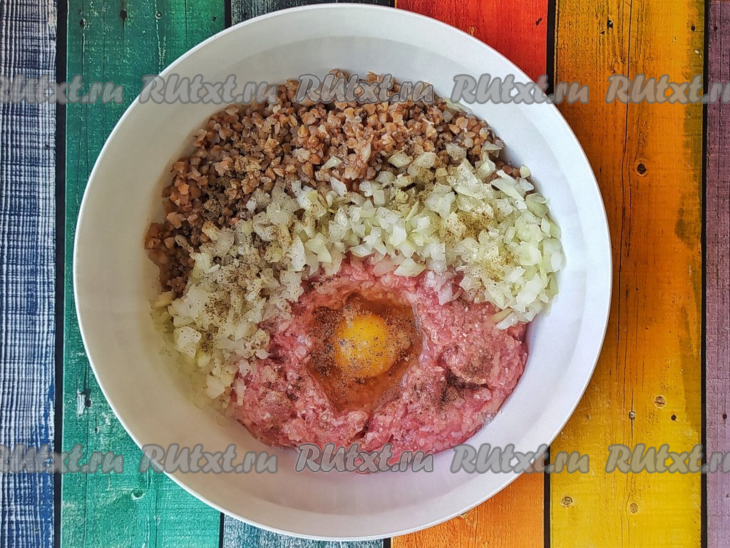 Фарш можно брать любой, у меня - из индейки, в готовом блюде он ароматнее куриного и более нежный, чем свиной или говяжий. Соединить в глубокой миске сырой фарш, остывшую гречку, мелко нарезанный лук и сырое яйцо, посолить и поперчить.