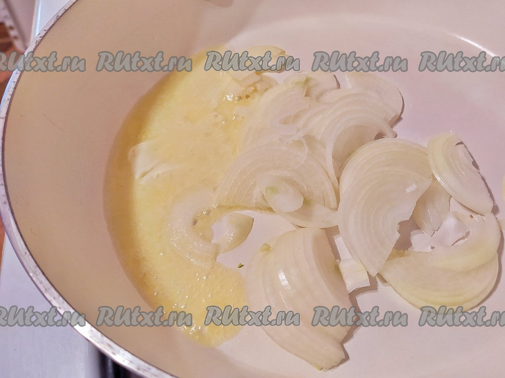 Пока гречаники запекаются, приготовим соус, для этого вторую луковицу нарезать (я нарезала на тонкие полукольца). На сковороде разогреть подсолнечное и сливочное масло, затем выложить нарезанный лук, обжарить, помешивая, на среднем огне в течение 3-4 минут.