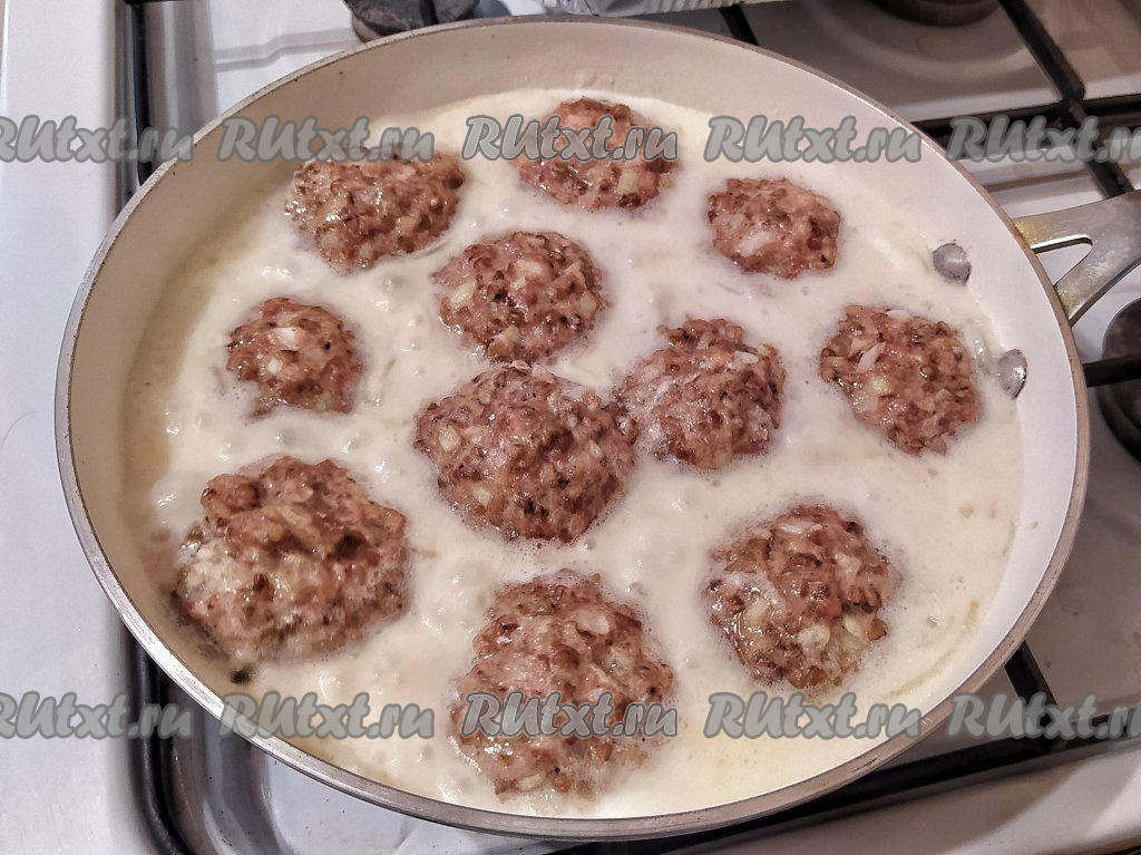 Переложить гречаники по одному в сковороду со сметанным соусом, снова довести соус до кипения, а затем тушить на минимальном огне под закрытой крышкой 10 минут. В процессе тушения можно гречаники полить сверху соусом или перевернуть их один раз на противоположную сторону, чтобы они пропитались сметаной со всех сторон.