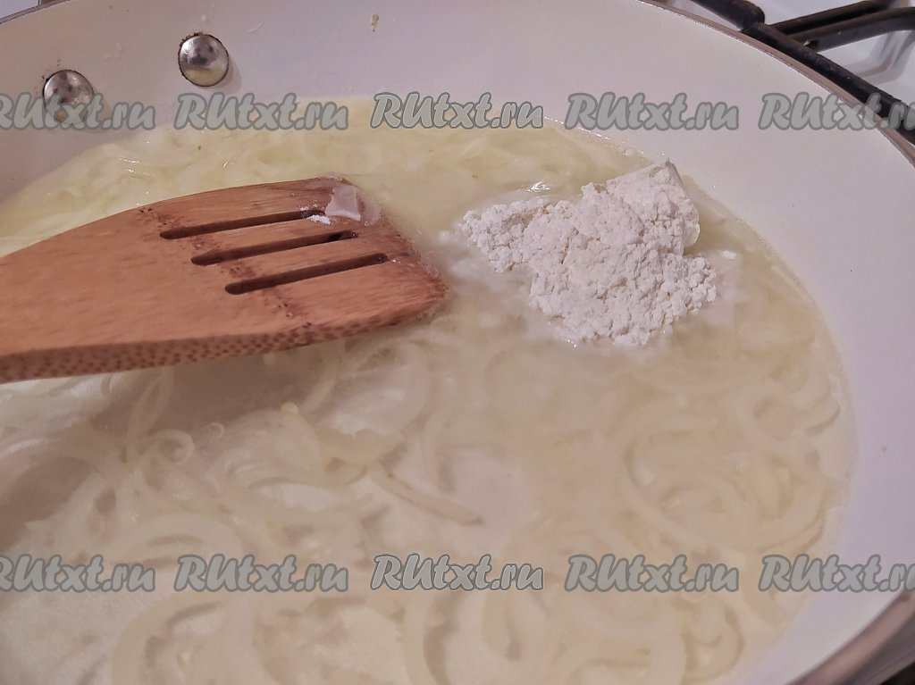Аккуратно влить 250-300 мл холодной воды, всыпать муку, перемешать, чтобы не осталось комочков, прогреть, помешивая, на среднем огне до однородности получившейся смеси. Выложить сметану, посолить, добавить любимые специи, тщательно перемешать сметанный соус, довести на среднем огне, помешивая, до кипения и снять с огня.