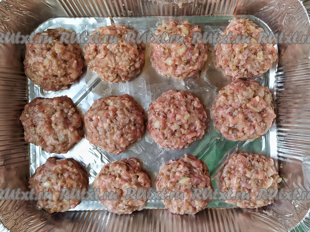 Из получившегося фарша слепить круглые котлеты - гречаники. Чтобы фарш не прилипал к рукам, необходимо смачивать руки водой. У меня получилось 15 гречаников диаметром, примерно, 6-7 см. Сформированные гречаники можно обжарить на сковороде в растительном масле до румяности с двух сторон. Я же предлагаю запечь их в духовке, для этого сформированные гречаники выложить на противень, застеленный фольгой (я запекала в два захода в форме размером 21 см х 27 см). Фольгу, перед выкладыванием на неё гречаников, можно маслом не смазывать. Запекать гречаники 30 минут в разогретой до 200 градусов духовке.