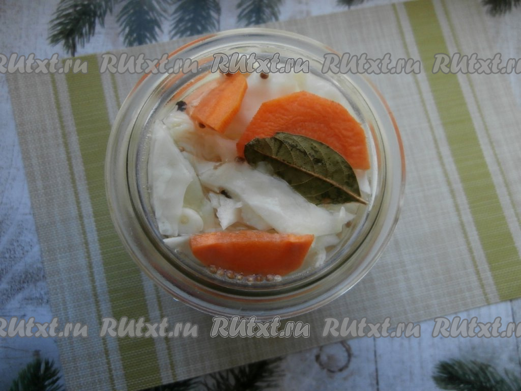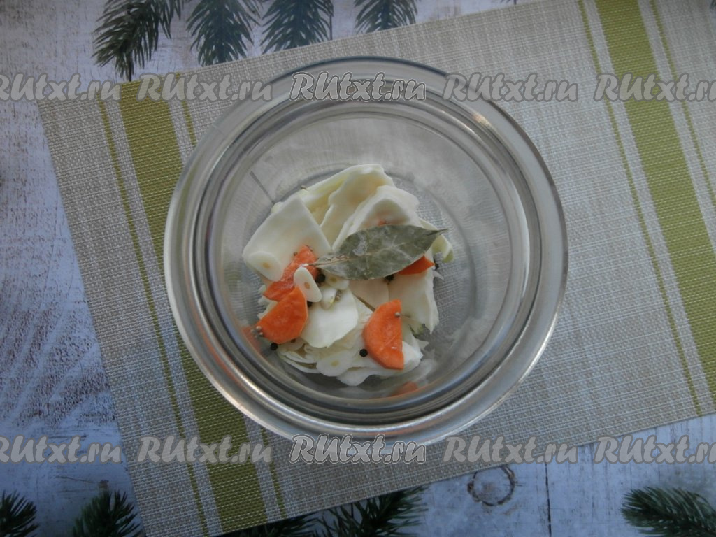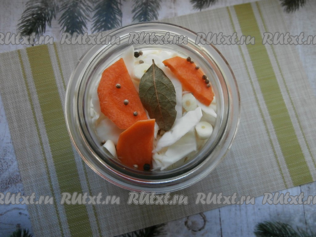 В чистую, сухую двухлитровую банку складывать капусту слоями, пересыпая её горошинами перца, кориандром, кусочками моркови и чеснока, добавить лавровый лист.