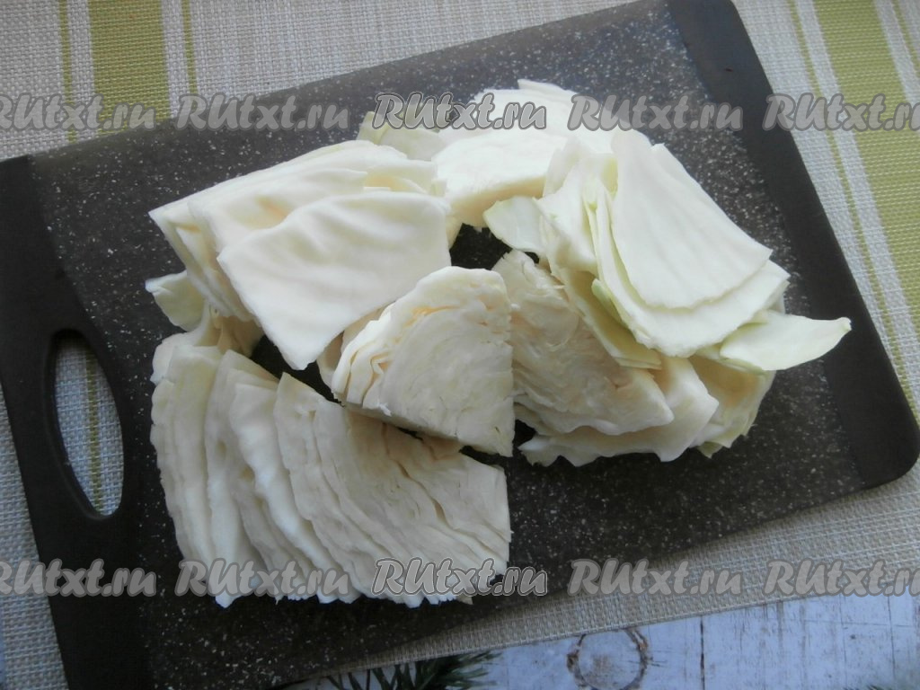 Нарезать капусту на крупные куски. Морковь и чеснок очистить и нарезать (я нарезала морковку на полукружочки, а чеснок - на пластины).