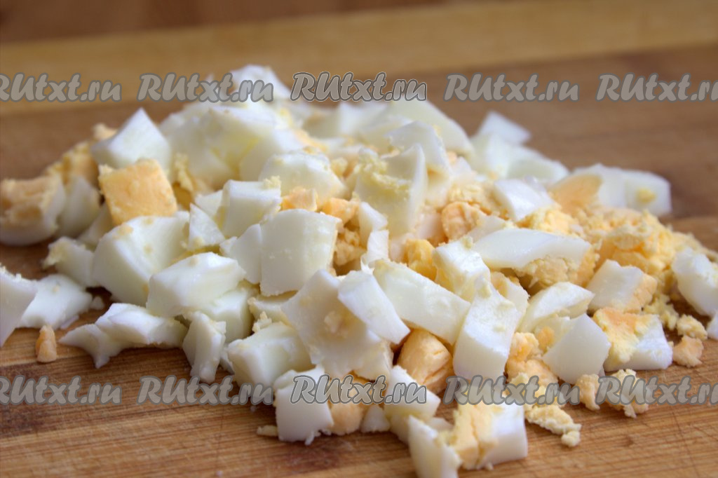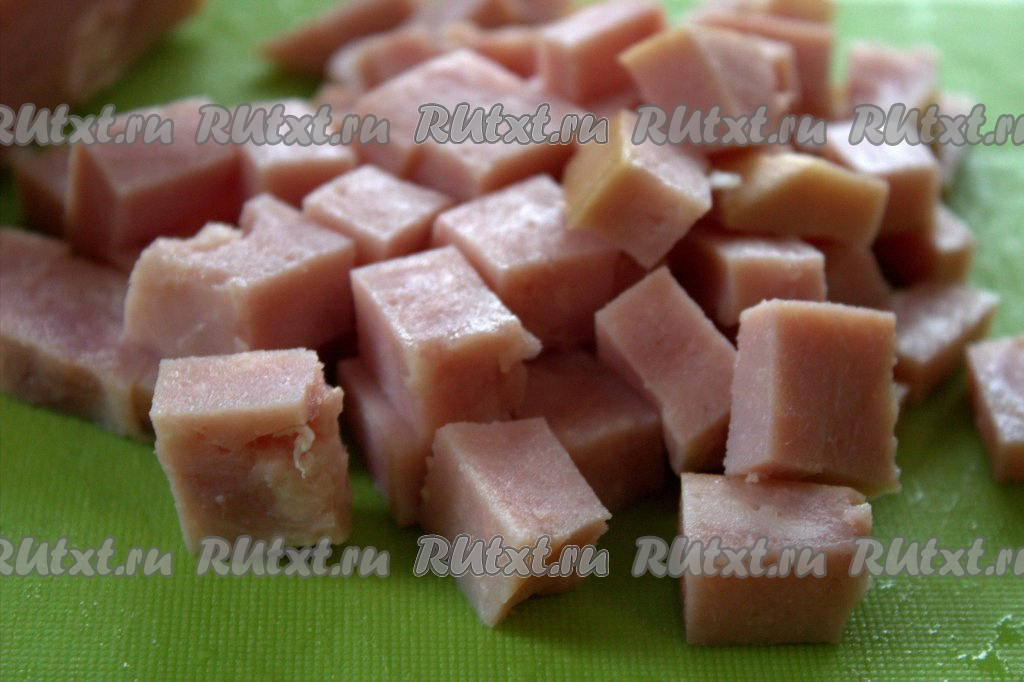 Ветчину нарезать на небольшие кубики.