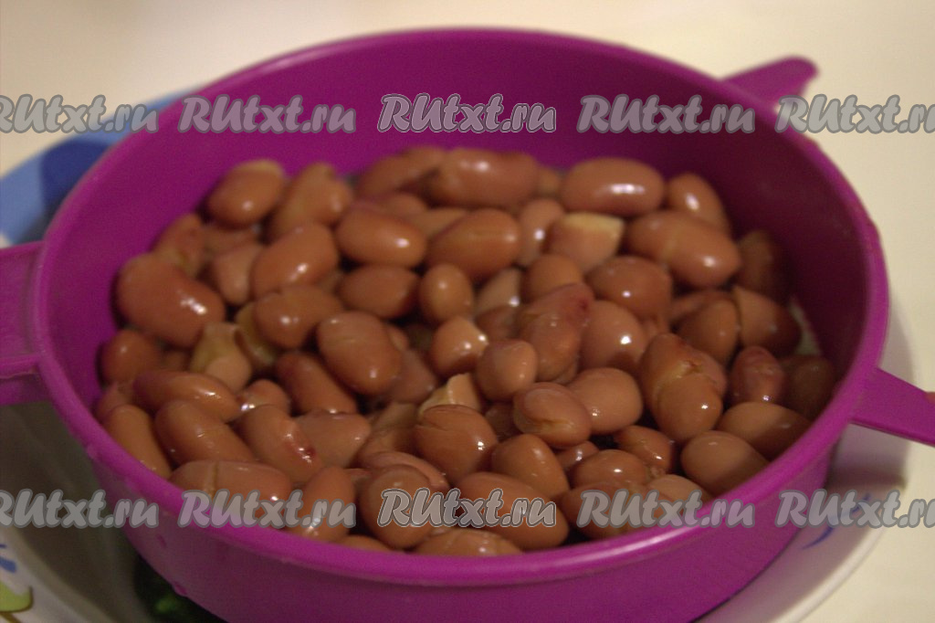 Красную консервированную фасоль переложить из банки в сито. Промыть фасоль водой и оставить на несколько минут в сите, чтобы стекла лишняя жидкость.