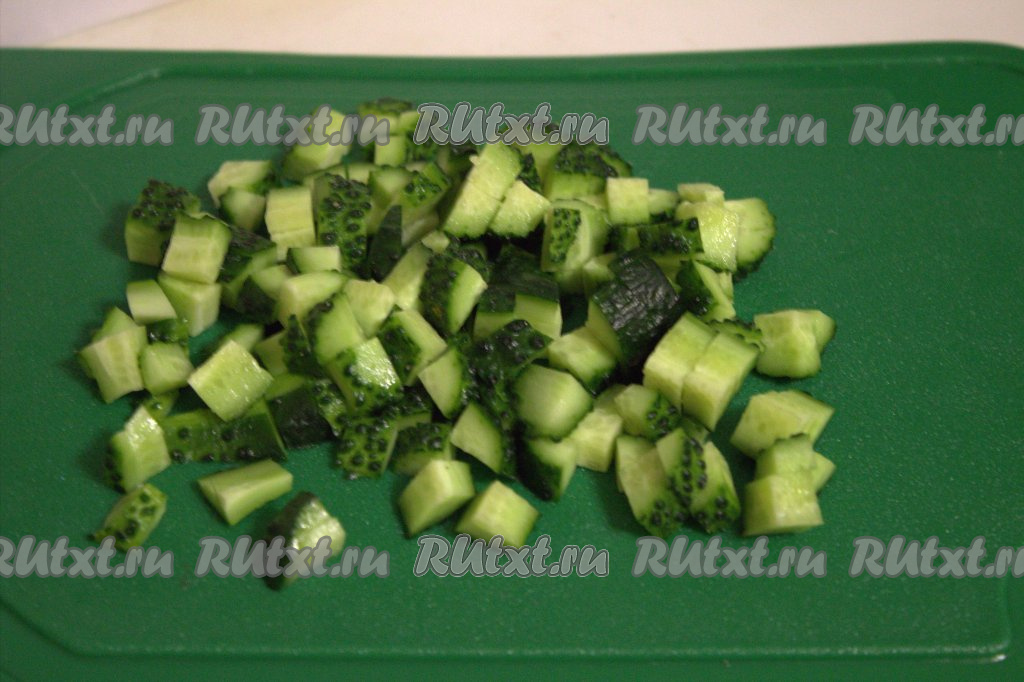 Свежие огурцы нарезать на кубики среднего размера.