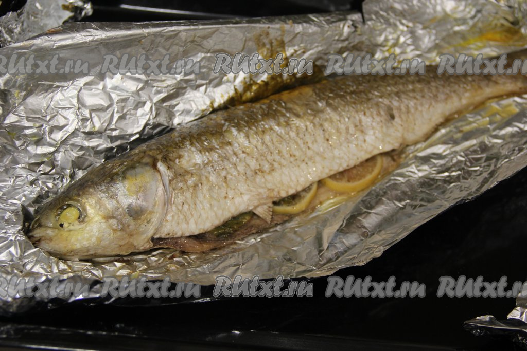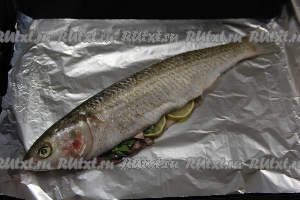 Завернуть кефаль в два слоя фольги, переложить на противень и отправить в разогретую духовку, запекать рыбу 40 минут при температуре 200 градусов.