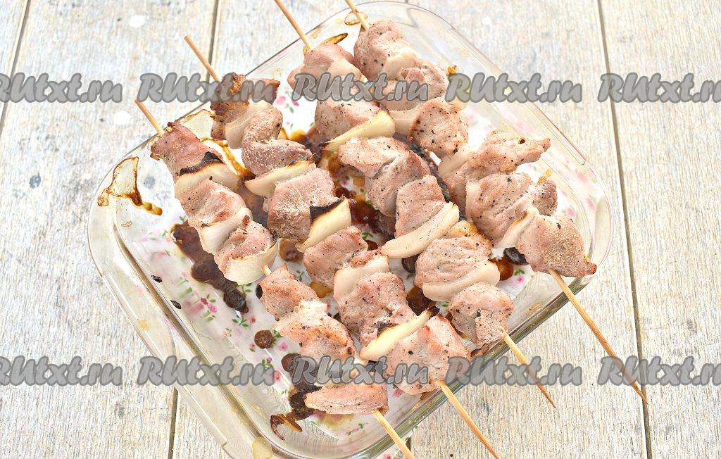 Замаринованные кусочки свинины, чередуя с луком, нанизываем на предварительно замоченные в воде деревянные шпажки. Шашлычки выкладываем на форму с бортиками, как на фото, отправляем в разогретую духовку.