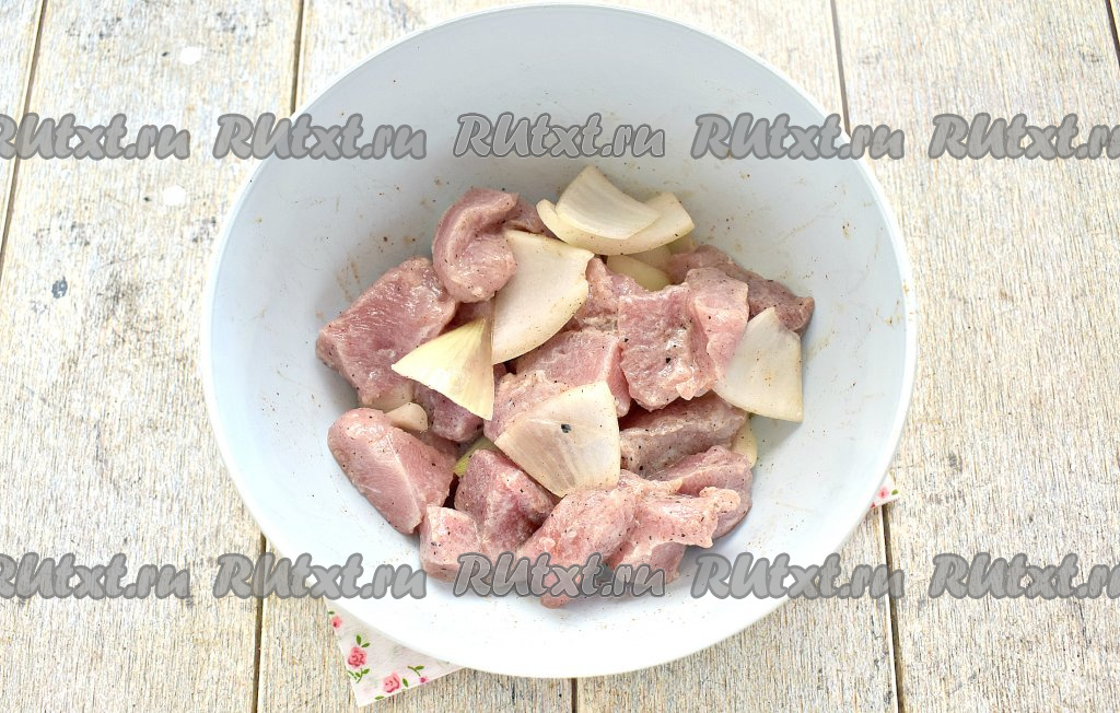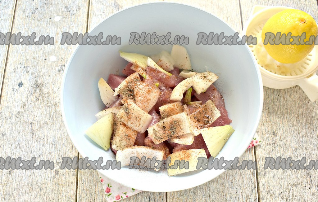 Выжимаем из половинки лимона сок и поливаем им кусочки свинины и лук.