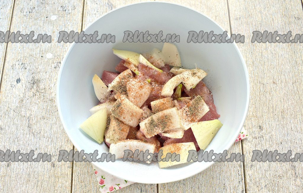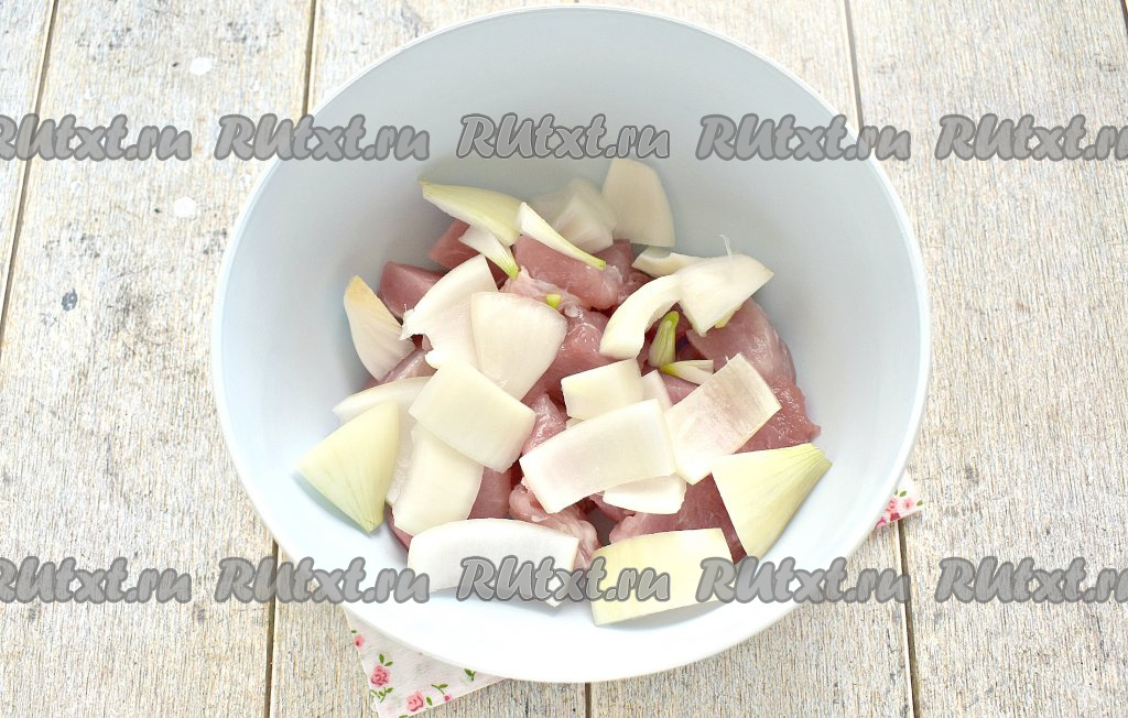 Очищаем репчатый лук, нарезаем его достаточно крупно (я нарезала в форме лепестков), чтобы его удобно было нанизывать на шпажки. Лук выкладываем в миску со свининой.