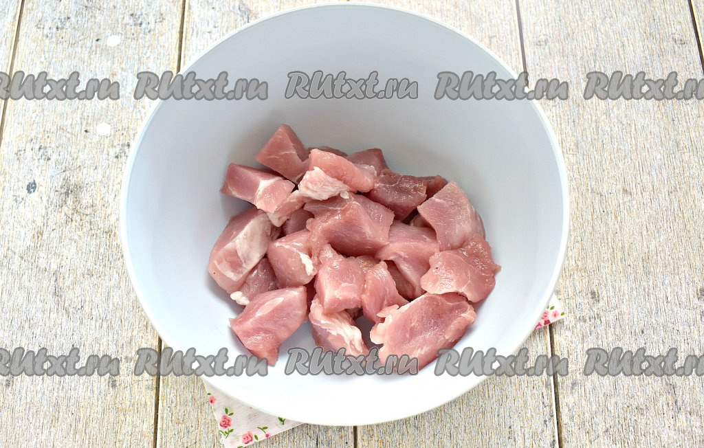 Свинину моем, обтираем бумажными полотенцами, а затем нарезаем на кусочки толщиной, примерно, 3 см и перекладываем в глубокую миску, удобную для маринования.
