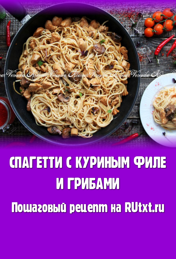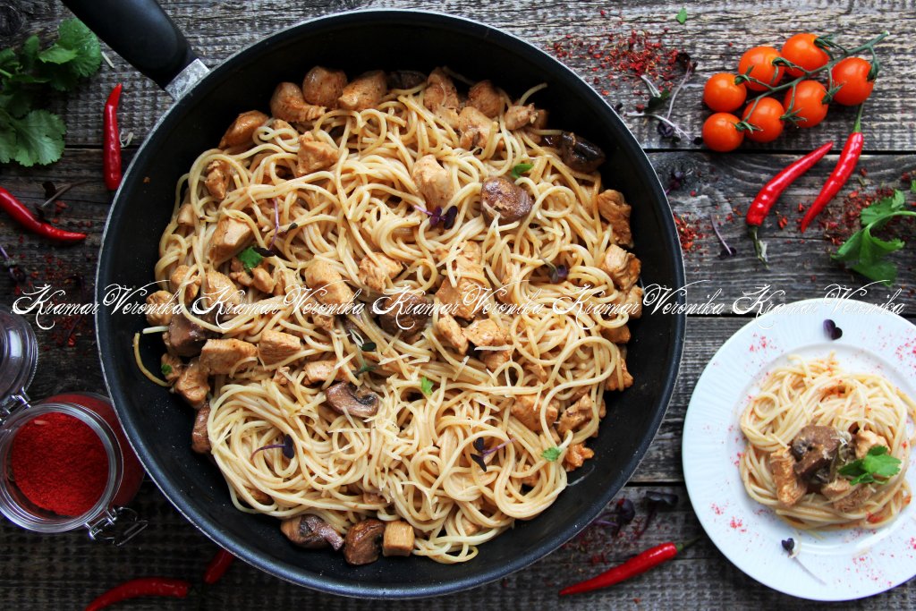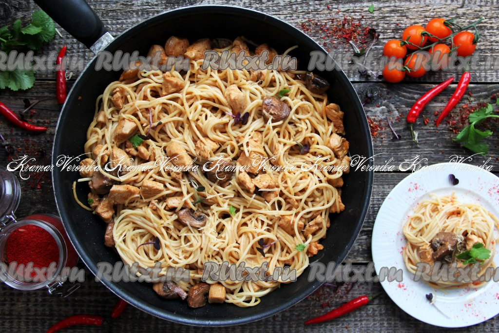 Добавить спагетти в сковороду к куриному филе с грибами.