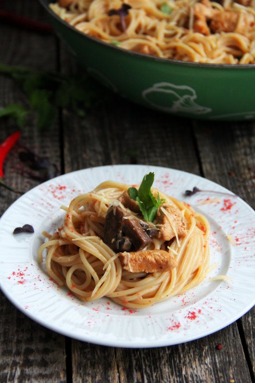 По желанию, присыпать блюдо при подаче тёртым сыром. Подавать вкусные, аппетитные спагетти с куриным филе и грибами следует в горячем виде.