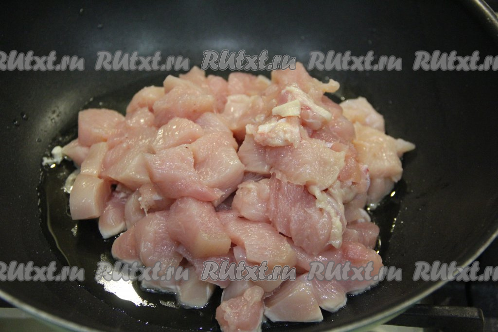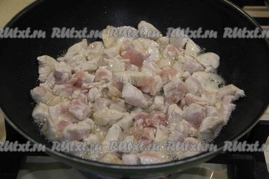 Обжарить кусочки курочки в течение 10 минут, периодически перемешивая, на среднем огне.