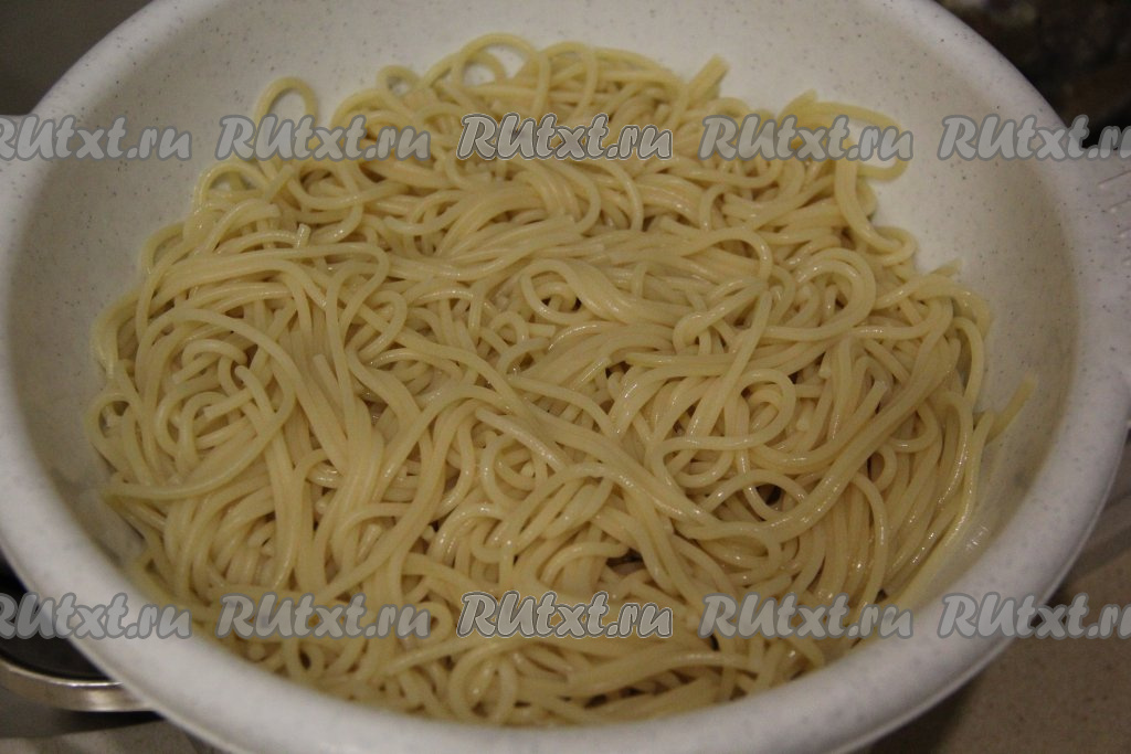 Готовые спагетти откинуть на дуршлаг, промыть в холодной воде, оставить на несколько минут, чтобы лишняя жидкость полностью стекла.