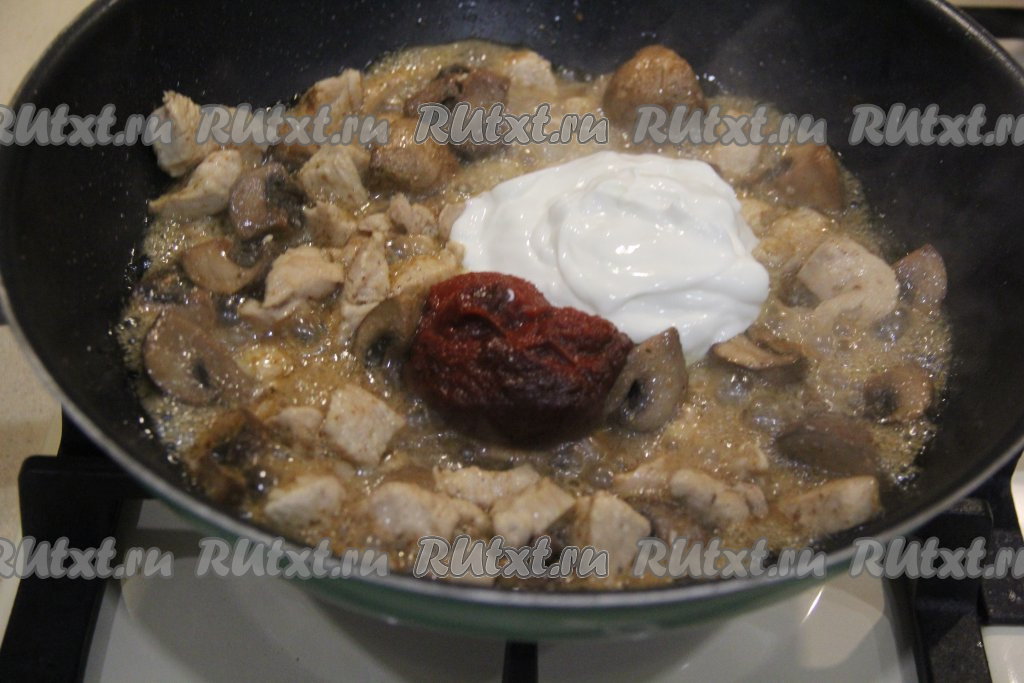 Затем посолить, добавить томатную пасту и сметану, перемешать и протушить на небольшом огне минуты 2-3.