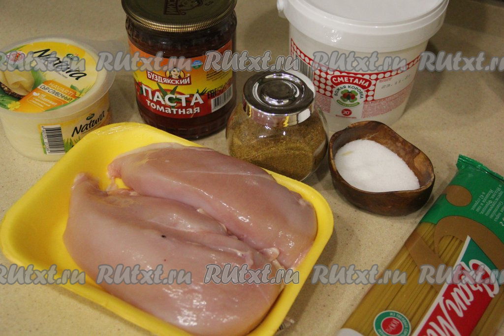 В подходящую кастрюлю налить воду, дождаться её закипания и выложить спагетти. Подсолить воду по вкусу. Варить спагетти после закипания на медленном огне до готовности. Время варки можно посмотреть в инструкции на упаковке, обычно спагетти готовы через 8-10 минут после закипания воды. В сковороду с высокими бортиками влить немного растительного масла и выложить нарезанное на средние кусочки куриное филе.