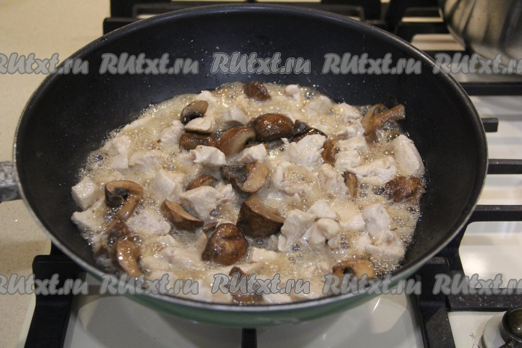 Добавить к курице нарезанные шампиньоны (замороженные грибы предварительно размораживать не нужно). Грибочки выделят жидкость. Тушить минут 10-15, без крышки, иногда перемешивая содержимое сковороды.