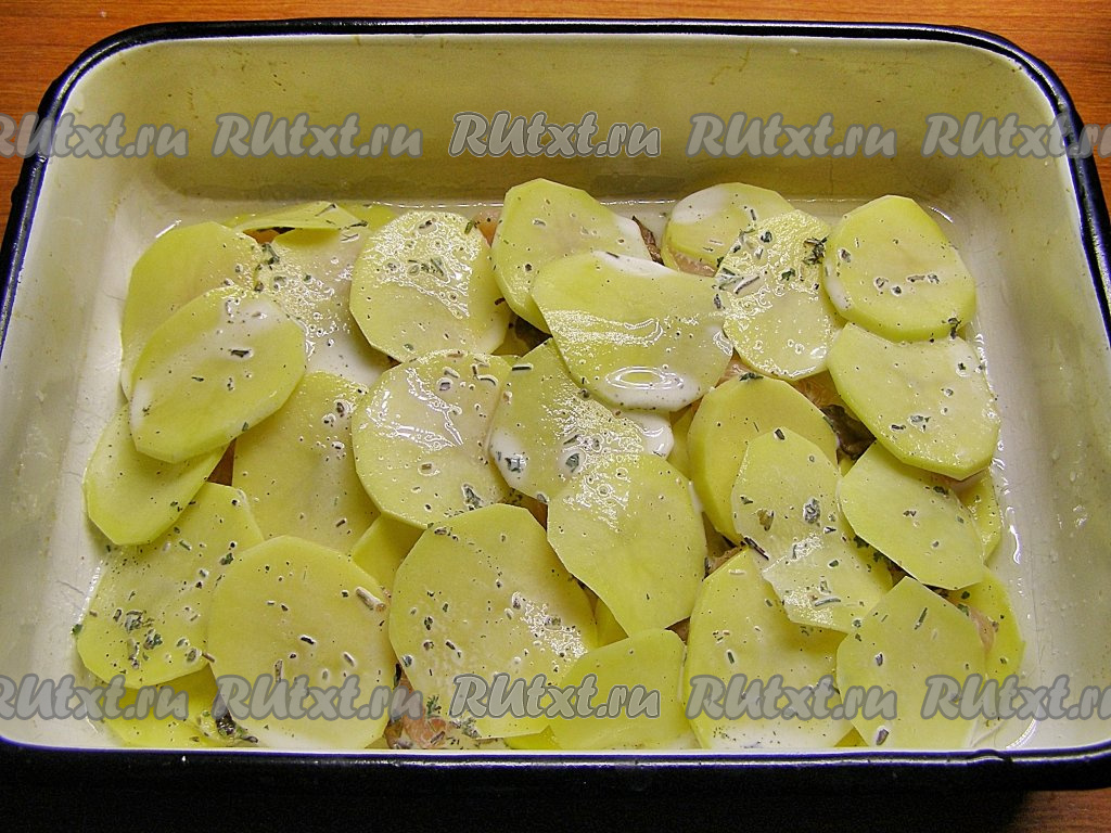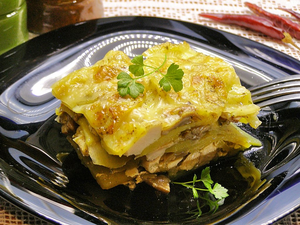 Сверху выкладываем ещё слой картошки, солим и поливаем 2-3 столовыми ложками молочного соуса. Далее снова выкладываем слой лука с грибами и куриное филе, кружочки картошки, присаливаем и поливаем частью соуса. Таким образом слоями собираем гратен. В зависимости от размеров формы должно получиться 3-5 слоёв.