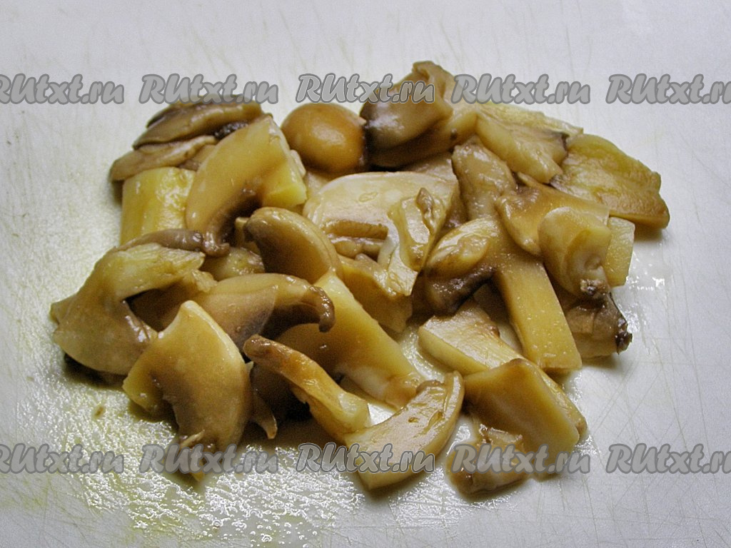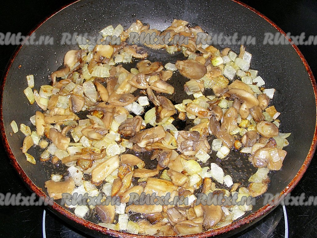 В сковородке слегка разогреваем растительное масло и выкладываем в неё лук. Обжариваем, помешивая, 2-3 минуты на среднем огне. Затем добавляем нарезанные грибы и жарим, иногда перемешивая, минут 10-15 (пока из грибочков не испарится почти вся влага). Убираем сковороду с огня.