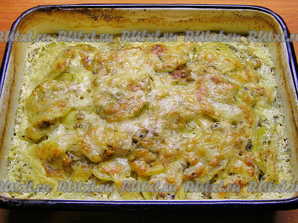 Верхним слоем должен быть слой из ломтиков картофеля. Заливаем гратен оставшимся молочным соусом и посыпаем натёртым сыром.