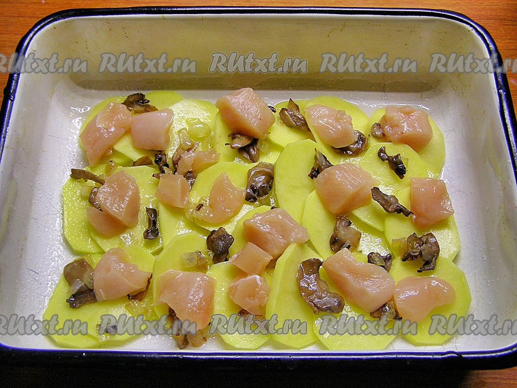 На картофельный слой кладём часть обжаренных грибов с луком и часть кусочков куриного мяса.