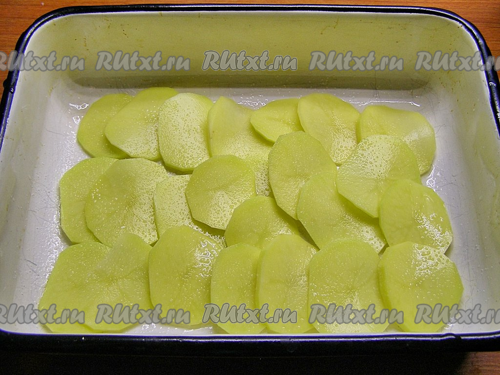 Форму для запекания смазываем растительным маслом и выкладываем часть картофельных ломтиков в один слой. Слегка солим. Можно использовать как обычную соль, так и адыгейскую.