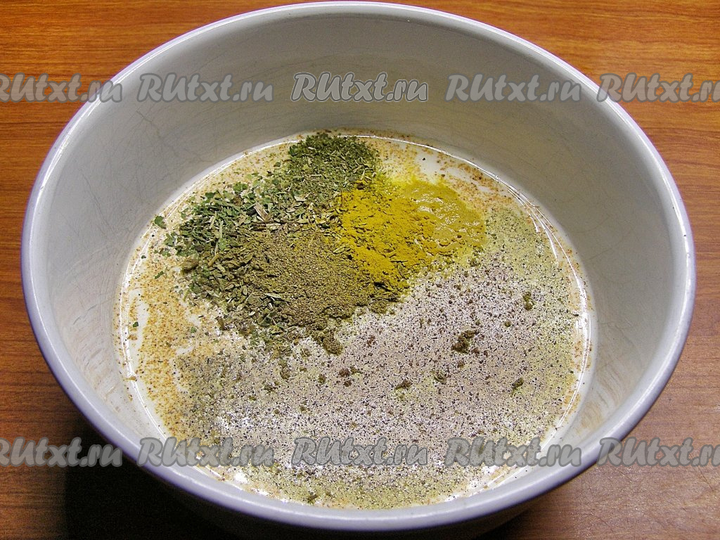 Для приготовления соуса смешиваем сливки с молоком, солим, добавляем сушёную зелень, специи и приправы по вкусу (я добавила по 1 чайной ложке куркумы и хмели-сунели, примерно, пол чайной ложки красного и чёрного молотых перцев и щепотку мускатного ореха), тщательно перемешиваем получившийся молочный соус.