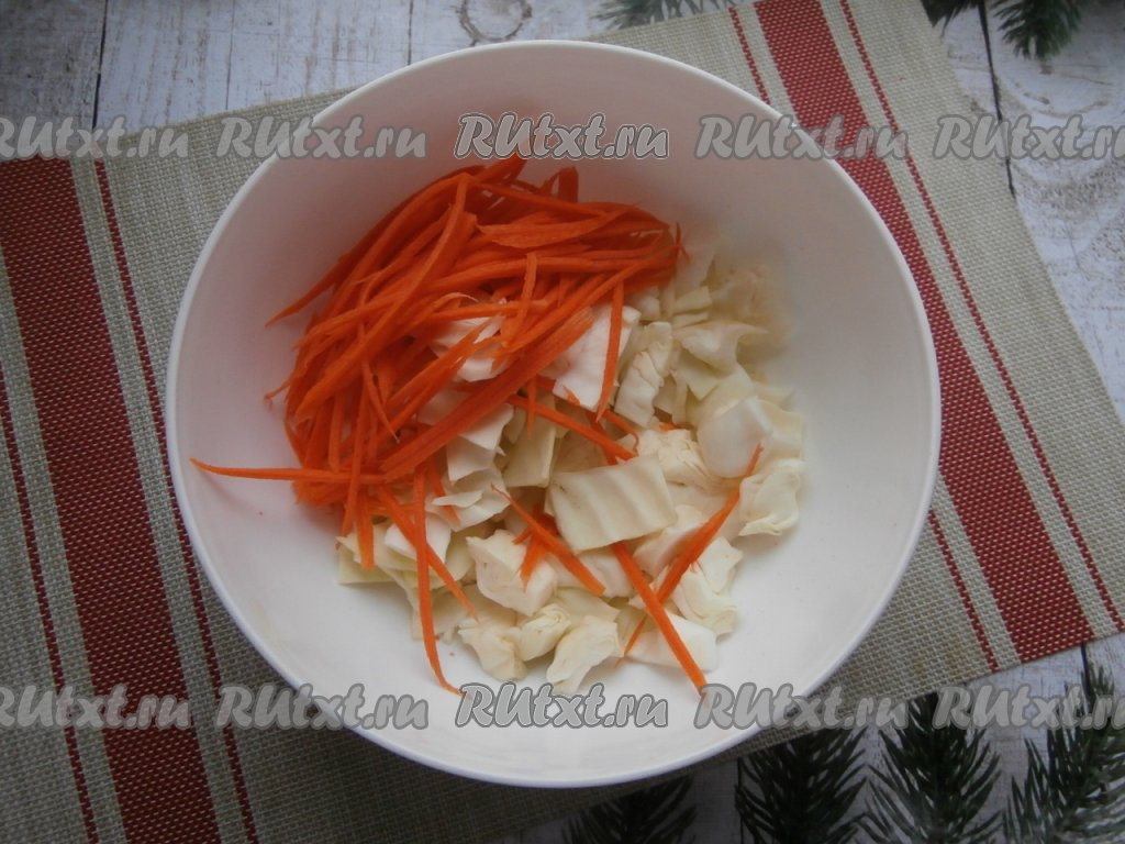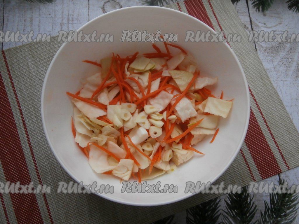 Посолить капусту с морковкой, немного помять руками, затем добавить зубчики чеснока, нарезанные на пластины.