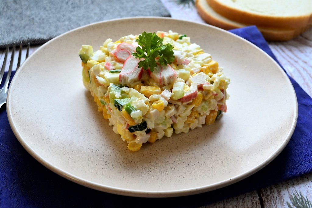 Аппетитный, очень вкусный, достаточно сочный салат, приготовленный с кукурузой, варёным рисом, крабовыми палочками и свежим огурцом, можно подавать к столу.