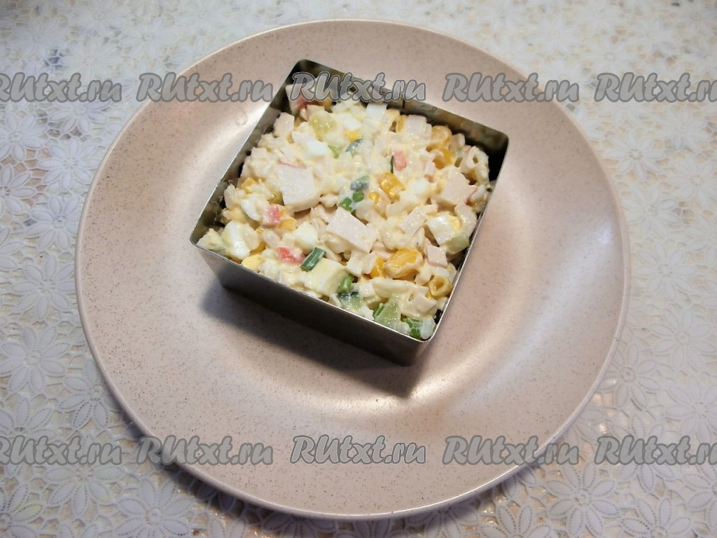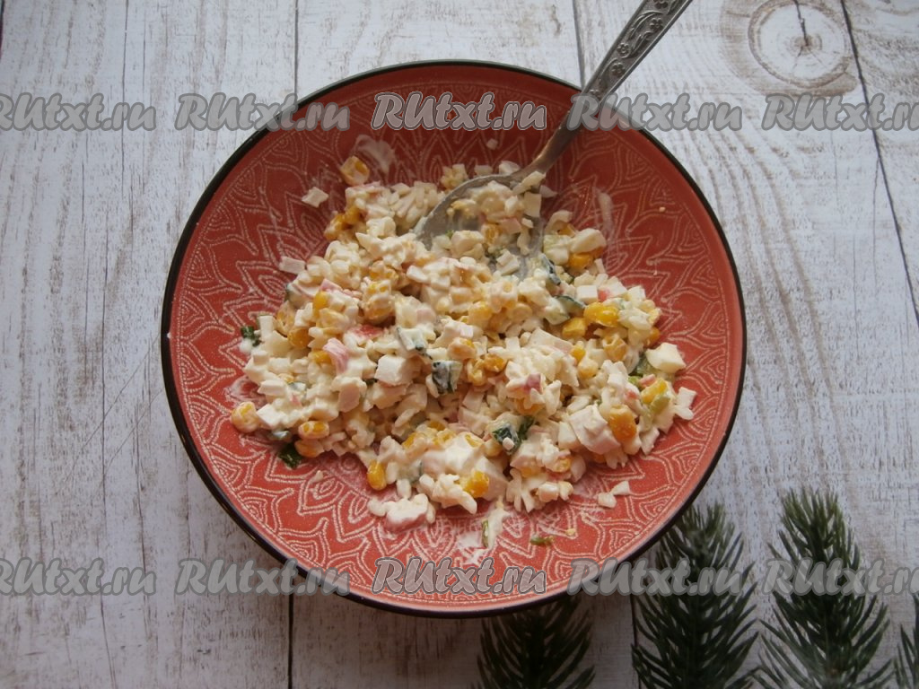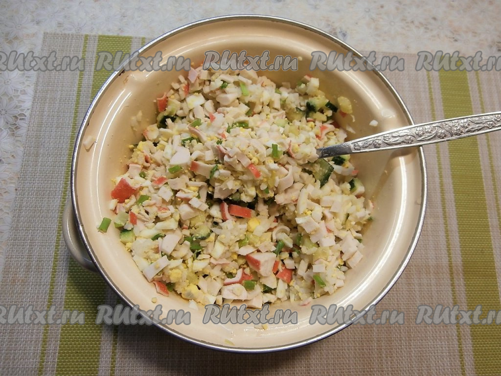 Заправить салат майонезом. Крабовый салат можно подать в одном салатнике или порционно.