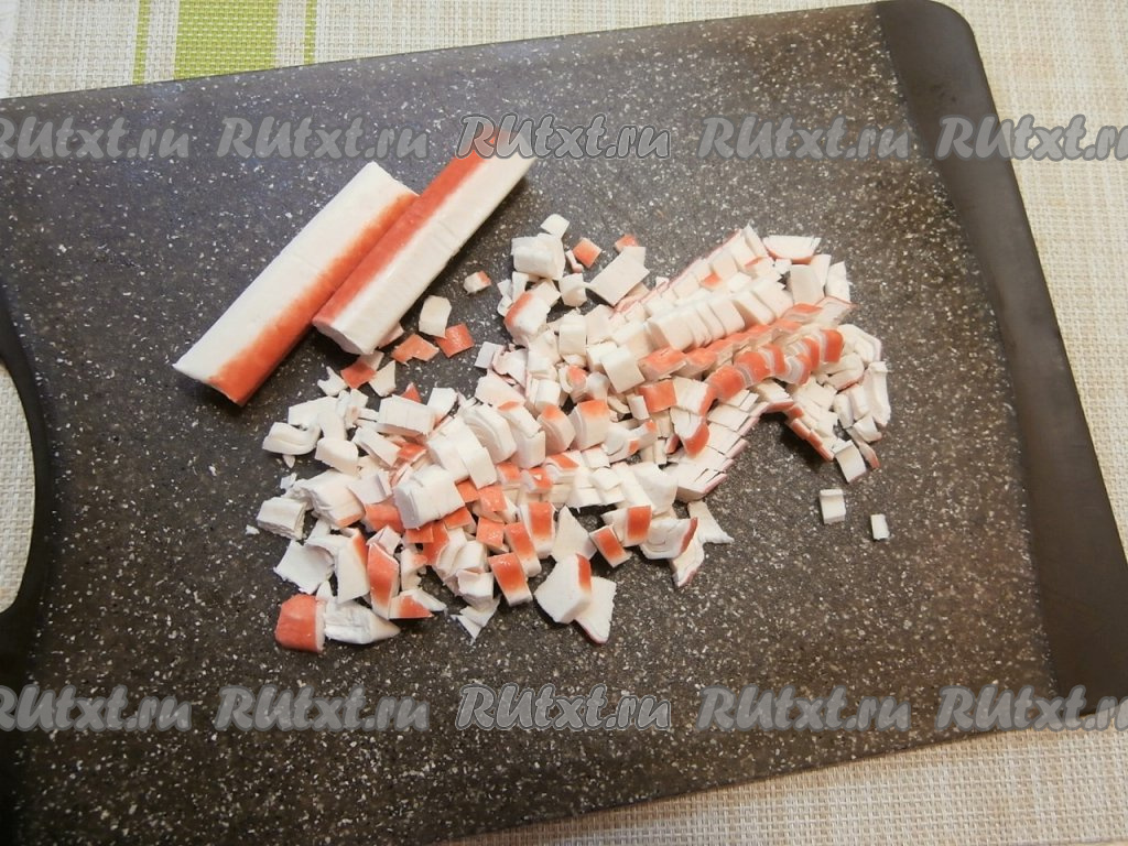 Прежде всего нужно отварить до готовности рис, для этого после промывания его нужно выложить в кастрюлю, залить холодной водой (воды должно быть в 2 раза больше, чем риса), поставить на огонь, а после закипания воду подсолить, перемешать рис и отварить его на небольшом огне до готовности (минут 15), помешивая. Вода полностью должна испариться, остудить отваренный рис. Замороженные крабовые палочки полностью разморозить, а затем освободить их от плёнки и нарезать на небольшие кусочки.