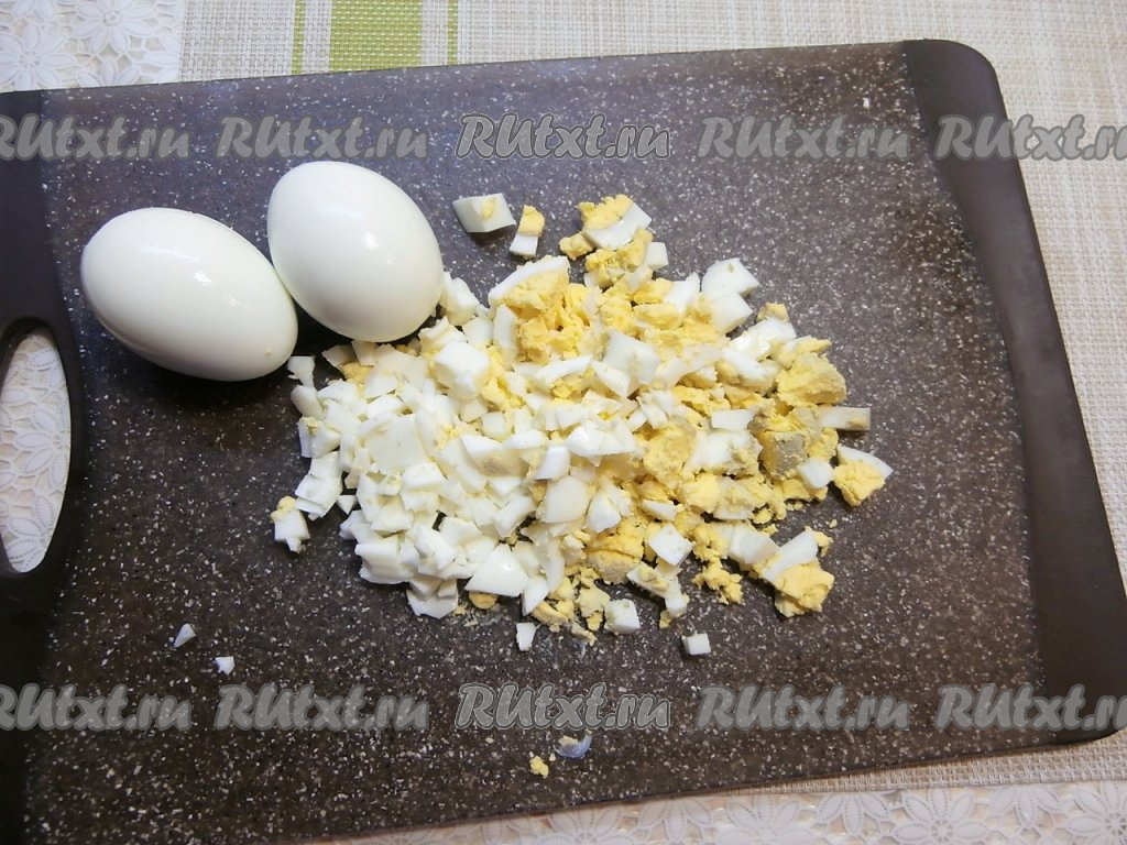 Яйца предварительно отварить в течение 8-10 минут в кипящей воде, затем остудить их в холодной воде, очистить и порубить ножом на небольшие кусочки.