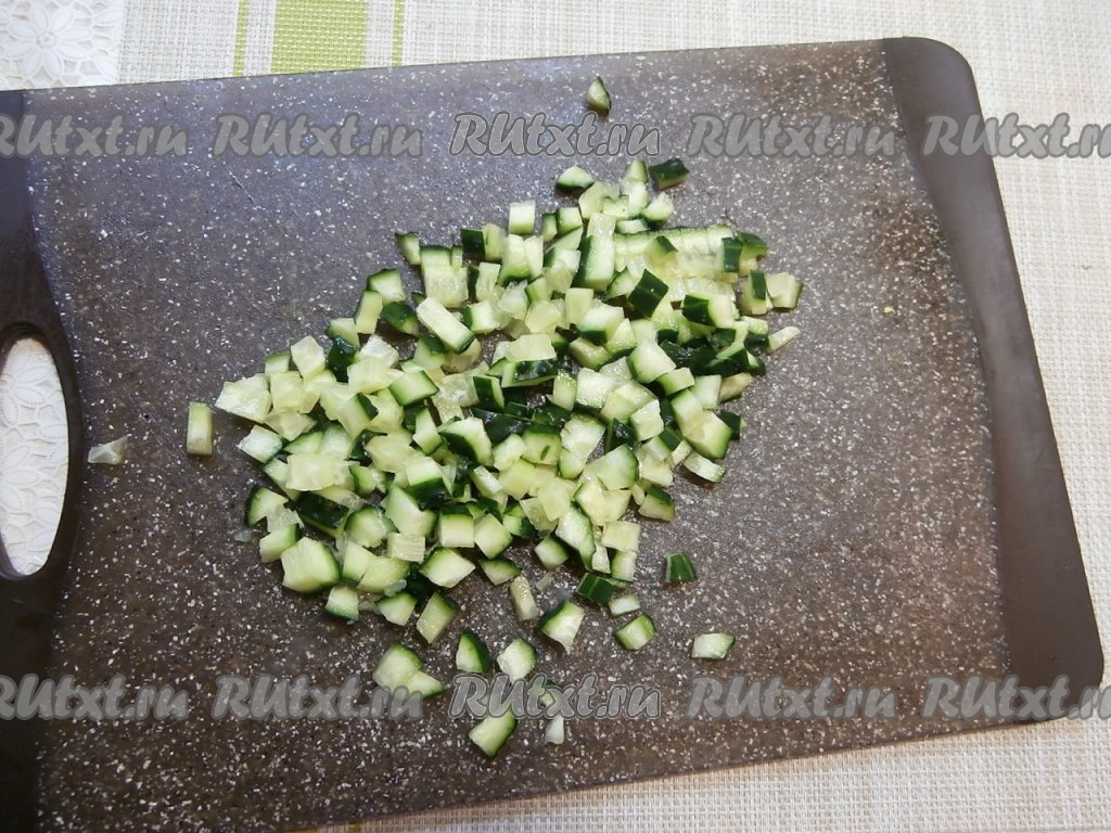 Свежий огурчик тоже нарезать на небольшие кубики.