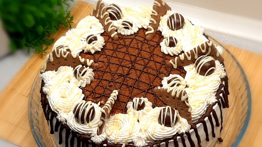 По желанию, торт можно украсить растопленным шоколадом. Я перекладываю кусочек чёрного шоколада в кондитерский мешок, отправляю в микроволновку на 10 секунд, проверяю, если шоколад ещё не стал жидким, отправляю в микроволновку ещё на 10 секунд. Как только шоколад станет жидким, срезаю край пакета и делаю произвольные подтёки шоколадом по бокам торта.